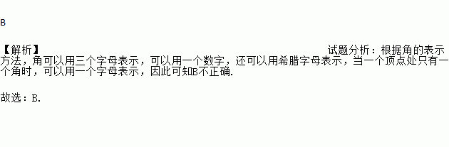 B 【解析】试题分析:根据角的表示方法,角可以用三个字母表示,可以用一个数字,还可以用希腊字母表示,当一个顶点处只有一个角时,可以用一个字母表示,因此可知B不正确. 故选:B.