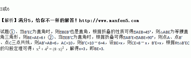 如图,矩形ABCD中,AB=6,BC=8,点E是BC边上一点,连接AE,把∠B沿AE折叠,使点B落在点B′处。当△CEB′为直角三角形时,BE的长为___.