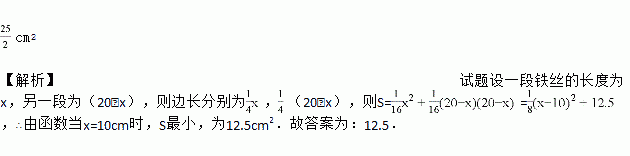 将一根长为20 cm的铁丝剪成两段,并以每一段铁丝的长度为周长各做成一个正方形,则这两个正方形面积之和的最小值是______cm2.