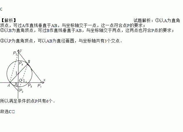 如图,已知点A(-1,0)和点B(1,2),在坐标轴上确定点P,使得△ABP为直角三角形,那么满足条件的点P共有( )