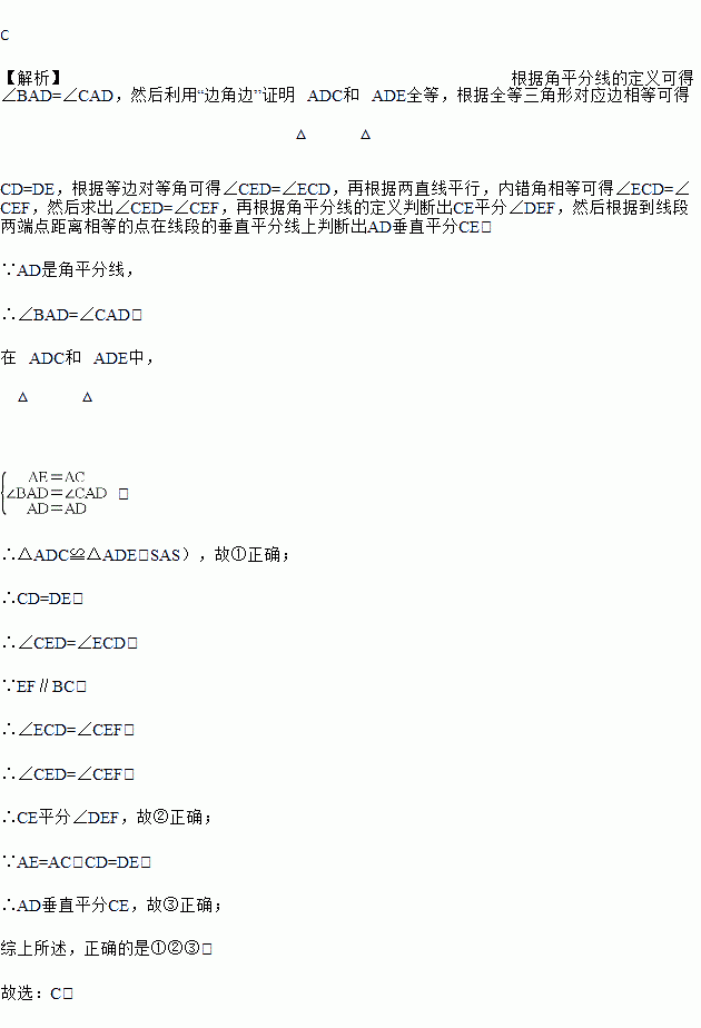 如图,AD是角平分线,E是AB上一点,AE=AC,EF∥BC交AC于F.下列结论①△ADC≌△ADE;②EC平分∠DEF;③AD垂直平分CE.其中结论正确的有( )个
