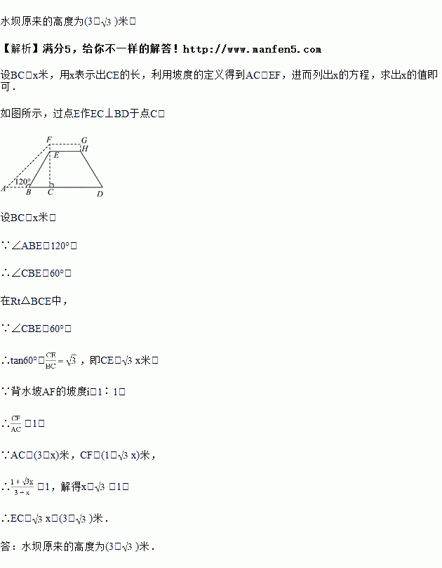 如图,市防汛指挥部决定对某水库的水坝进行加高加固,设计师提供的方案是:水坝加高1米(EF=1米),背水坡AF的坡度i=1∶1,已知AB=3米,∠ABE=120°,求水坝原来的高度.