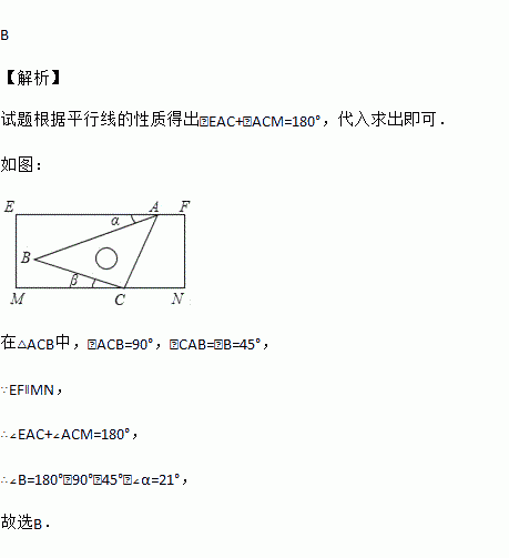 如图,将一个等腰直角三角板按照如图方式,放置在一个矩形纸片上,其中∠α=24°,则∠β的度数为( )
