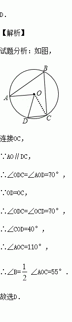 如图,A、B、C、D四个点均在⊙O上,∠AOD=70°,AO∥DC,则∠B的度数为( )