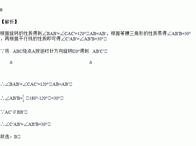 如图,△ABC为钝角三角形,将△ABC绕点A按逆时针方向旋转120°得到△A′B'C′,连接BB',若AC′∥BB',则∠C′AB ′的度数为( )