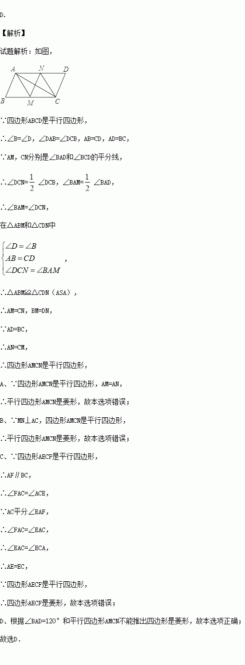 C.MN是∠AMC的平分线 D.∠BAD=120°