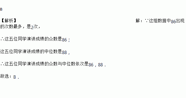 后成绩如下表所示:那么这五位同学演讲成绩的众数与中位数依次是 ( )