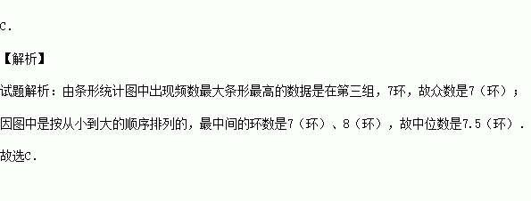 某射击小组有20人,教练根据他们某次射击的数据绘制成如图所示的统计图,则这组数据的众数和中位数分别是( )