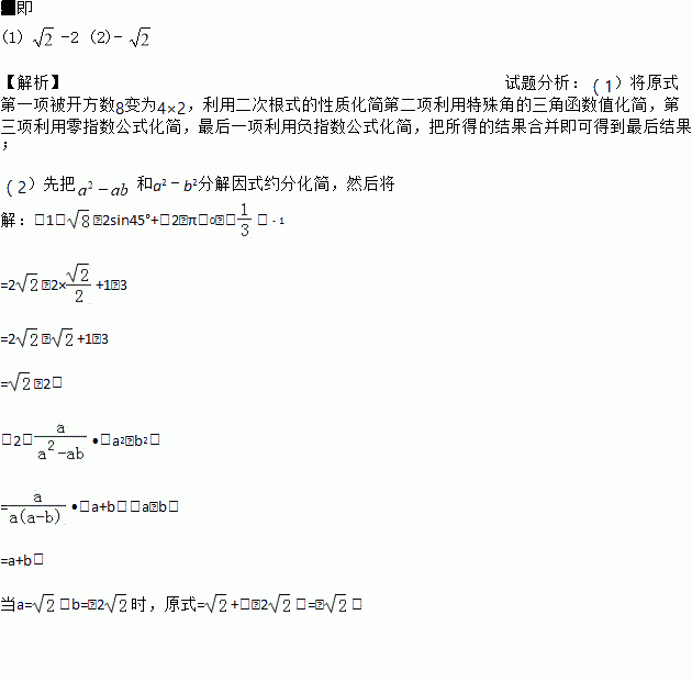(1)计算: ﹣2sin45°+(2﹣π)0﹣()﹣1;