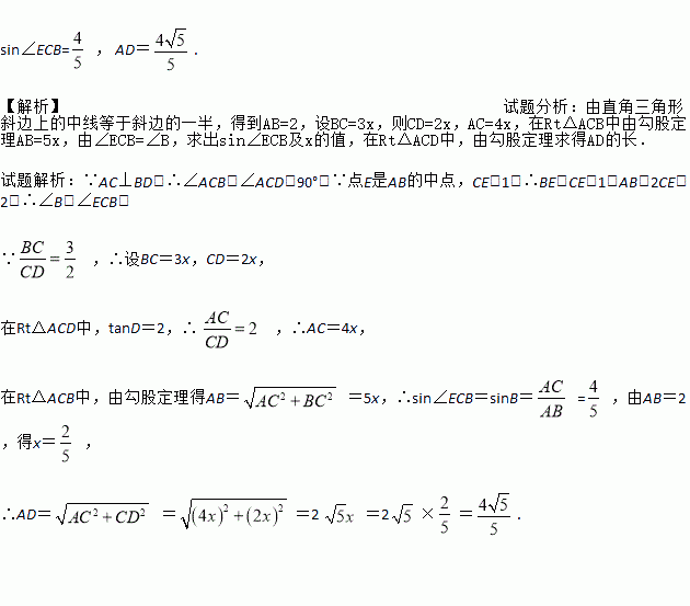 如图,在△ABD中,AC⊥BD于点C, ,点E是AB的中点,tanD=2,CE=1,求sin∠ECB的值和AD的长.