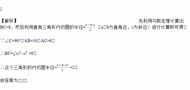 在△ABC中,∠C=90°,AB=10,且AC=6,则这个三角形的内切圆半径为_____.