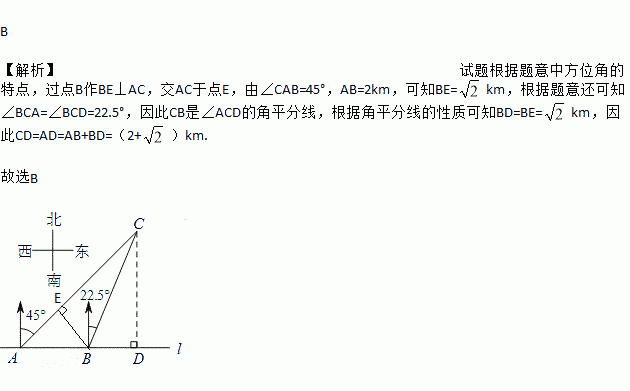 如图,在笔直的海岸线l上有A,B两个观测站,AB=2 km,从A处测得船C在北偏东45°的方向,从B处测得船C在北偏东22.5°的方向,则船C离海岸线l的距离(即CD的长)为( )