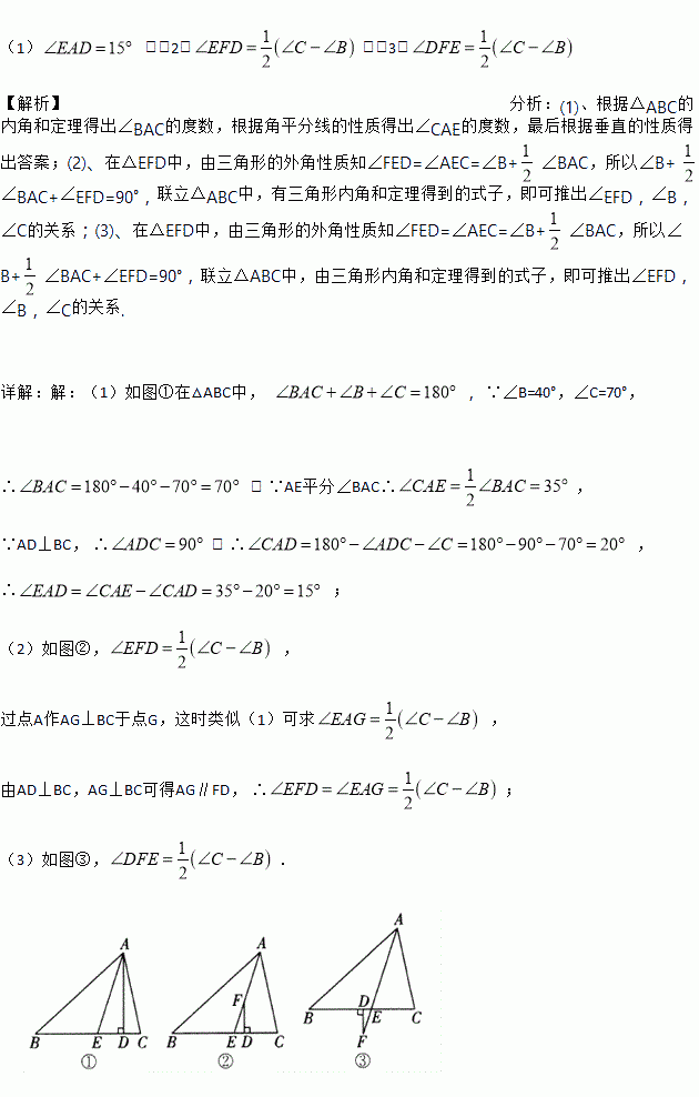 (1)如图①,∠B=40°,∠C=70°,求∠DAE的度数.