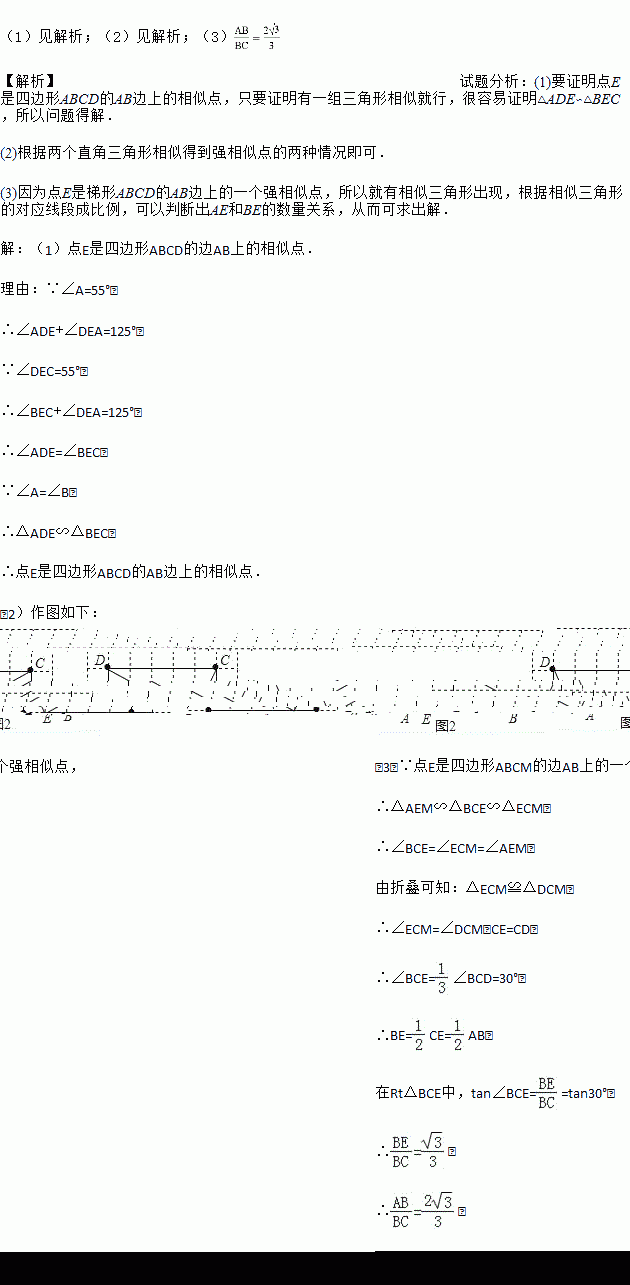 (1)如图1,∠A=∠B=∠DEC=55°,试判断点E是否是四边形ABCD的边AB上的相似点,并说明理由;