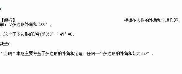 若一个正多边形的一个外角为45°,则这个正多边形的边数是( )