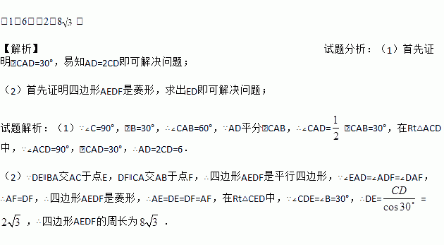 如图,在△ABC中,∠C=90°,∠B=30°,AD是△ABC的角平分线,DE∥BA交AC于点E,DF∥CA交AB于点F,已知CD=3.