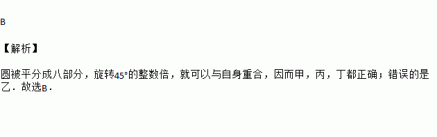 数学课上,老师让同学们观察如图所示的图形,问:它绕着圆心O旋转多少度后和它自身重合?甲同学说:45°;乙同学说:60°;丙同学说:90°;丁同学说:135°.以上四位同学的回答中,错误的是( )