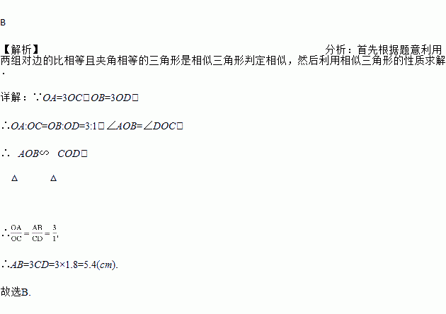 如图,比例规是一种画图工具,它由长度相等的两脚AC和BD交叉构成,利用它可以把线段按一定的比例伸长或缩短如果把比例规的两脚合上,使螺丝钉固定在刻度3的地方![]()