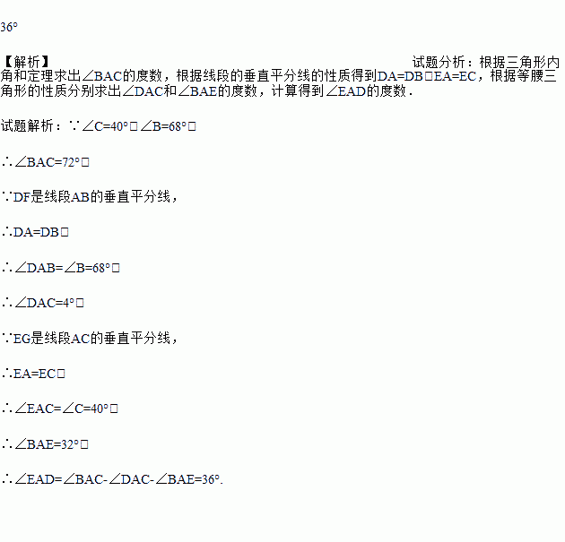 Èçͼ£¬ÔÚ¡÷ABCÖУ¬¡ÏC=40¡ã£¬¡ÏB=68¡ã£¬AB¡¢ACµÄ´¹Ö±Æ½·ÖÏß·Ö±ð½»BCÓÚD¡¢E£®Çó¡ÏEADµÄ¶ÈÊý.