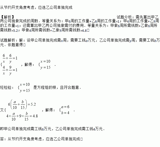 小明家准备装修一套新住房,若甲、乙两个装饰公司,合做需6周完成,需工钱5.2万元;若甲公司单独做4周后,剩下的由乙公司来做,还需9周才能完成,需工钱4.8万元,若只选一个公司单独完成,从节约开支角度考虑,小明家是选甲公司、还是乙公司请你说明理由.