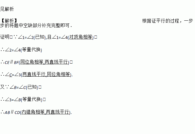 如图,已知∠1=∠2,∠B=∠C,可推得AB∥CD.理由如下: