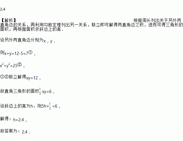 直角三角形的周长为12cm,斜边长为5cm,则斜边上的高是________ cm.