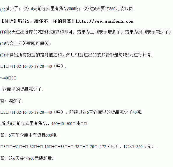 (3)如果进出的装卸费都是每吨5元,那么这6天要付多少元装卸费?