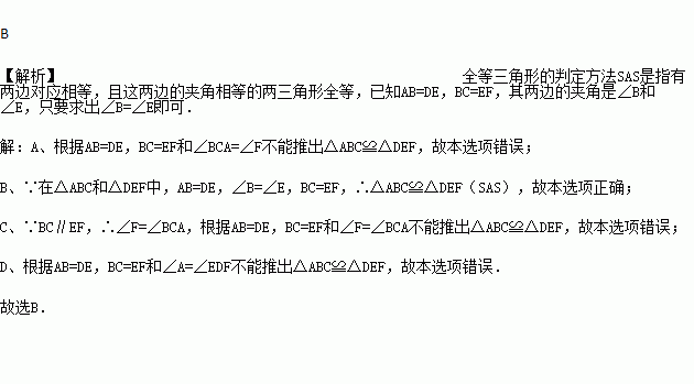 A. ∠BCA=∠F B. ∠B=∠E C. BC∥EF D. ∠A=∠EDF