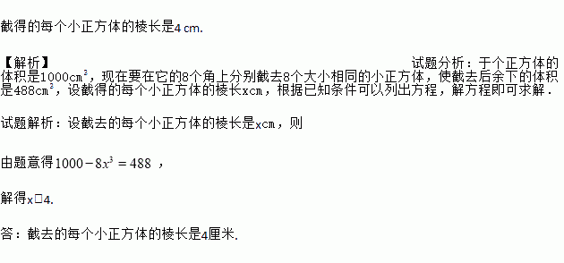 已知一个正方体的体积是1 000 cm3,现在要在它的8个角上分别截去8个大小相同的小正方体,使得截去后余下的体积是488 cm3,问截得的每个小正方体的棱长是多少?