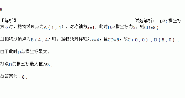 如图,点A,B的坐标分别为(1,4)和(4,4),抛物线y=a(x﹣m)2+n的顶点在线段AB上运动,与x轴交于C、D两点(C在D的左侧),点C的横坐标最小值为﹣3,则点D的横坐标最大值为________ .