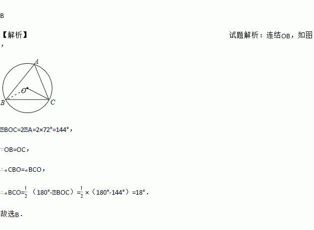 如图,⊙O为△ABC的外接圆,∠A=72°,则∠BCO的度数为( )