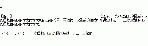 已知正比例函数y=kx(k≠0)的函数值y随x的增大而增大,则一次函数y=kx+k的图象大致是( )