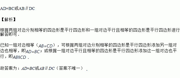 如图,已知四边形ABCD中,AB=DC,添加一个条件__使四边形ABCD是平行四边形.