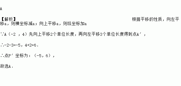 已知点A(-2 ,4),将点A 往上平移2个单位长度,再往左平移3个单位长度的到点A′,则点A′的坐标是( )