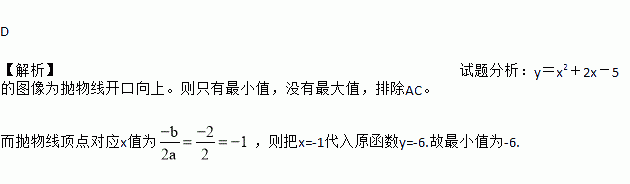 D 【解析】试题分析:y=x2+2x-5的图像为抛物线开口向上。则只有最小值,没有最大值,排除AC。 而抛物线顶点对应x值为,则把x=-1代入原函数y=-6.故最小值为-6.