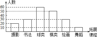 2010年5月18日“全国首届农村地区基础教育课程改革研讨会”在綦江召开,我县的“2+x”拓展课程受到专家的高度评价.在100多项“2+x”拓展课程中,教育行政主管部门对其中若干学生参加球类、棋类、绘画、书法、摄影、舞蹈活动的人数比例情况进行调查,所得的部分数据绘制了下面两幅不完整的统计图.