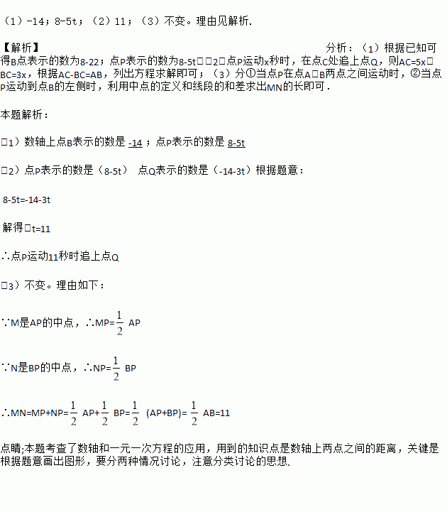 如图,已知数轴上点A表示的数为8,B是数轴上位于点A左侧一点,且AB=22,动点P从A点出发,以每秒5个单位长度的速度沿数轴向左匀速运动,设运动时间为t(t>0)秒.