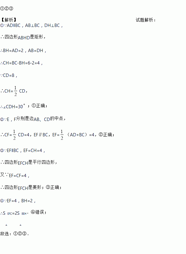 如图,在四边形ABCD中,AD∥BC,AB⊥BC,AD=2,BC=6,CD=8,E,F分别是边ABCD的中点, DH⊥BC于点H,连接EH,EC,EF,现有下列结论:①∠CDH=30°;②EF=4;③四边形EFCH是菱形;④S△EFC=3S△BEH.你认为结论正确的有___________.(填序号)