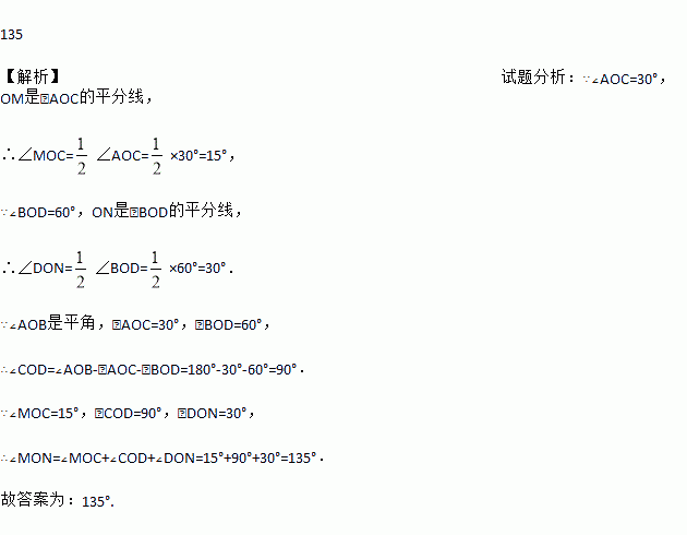 如图所示,∠AOB是平角,∠AOC=30°,∠BOD=60°,OM,ON分别是∠AOC,∠BOD的平分线,∠MON等于_______度.