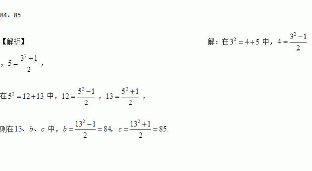 观察下列一组数,列举:3、4、5,猜想:32=4+5;列举:5、12、13,猜想:52=12+13;列举:72=24+25,猜想:72=24+25,……,列举:13、b、c,猜想:132=b+c.请你分析上述数据的规律,结合相关知识求得b=__________,c=__________