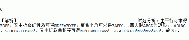 C 【解析】试题分析:由平行可求得∠DEF,又由折叠的性质可得∠DEF=∠D′EF,结合平角可求得∠AED′.∵四边形ABCD为矩形,∴AD∥BC,∴∠DEF=∠EFB=65°,又由折叠角相等可得∠D′EF=∠DEF=65°,∴∠AED′=180°﹣65°﹣65°=50°,故选C.