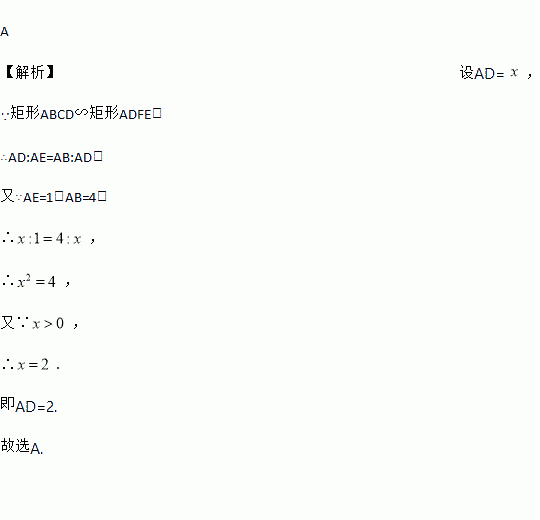 A 【解析】设AD= , ∵矩形ABCD∽矩形ADFE, ∴AD:AE=AB:AD, 又∵AE=1,AB=4, ∴, ∴, 又∵, ∴. 即AD=2. 故选A.