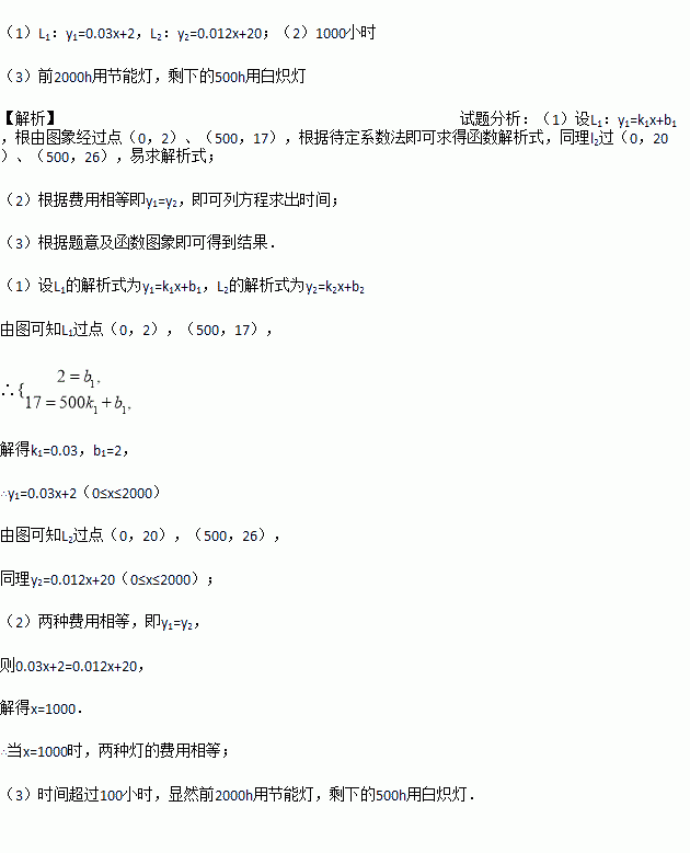 如图所示,l1和l2分别表示一种白炽灯和一种节能灯的费用y(元)与照明时间x(小时)的函数关系图象,假设两种灯的使用寿命都是2000小时,照明效果一样.(费用=灯的售价+电费)