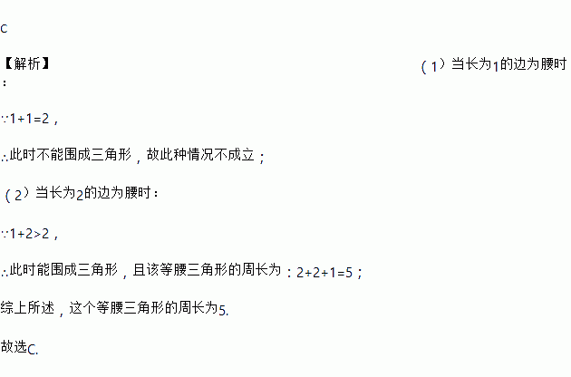 已知某等腰三角形两边长长分别为1,2,则周长为( )