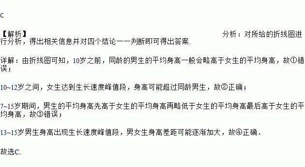 ③7~15岁期间,男生的平均身高始终高于女生的平均身高;