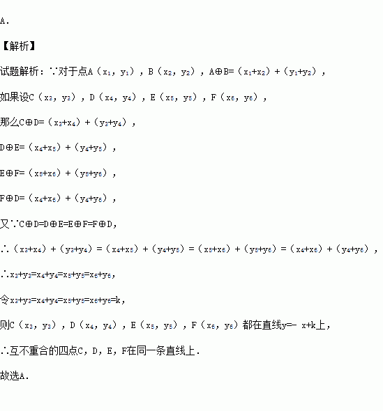 对于点A(x1,y1)、B(x2,y2),定义一种运算:A⊕B=(x1+x2)+(y1+y2).例如,A(-5,4),B(2,-3),A⊕B=(-5+2)+(4-3)=-2.若互不重合的四点C,D,E,F,满足C⊕D=D⊕E=E⊕F=F⊕D,则C,D,E,F四点( )