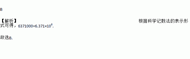 B 【解析】根据科学记数法的表示形式可得,6371000=6.371×106. 故选B.