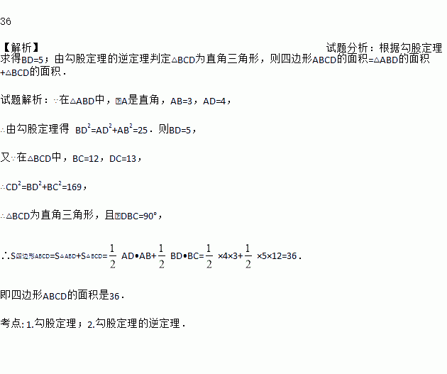 如图所示,在△ABD中,∠A是直角,AB=3,AD=4,BC=12,DC=13,求四边形ABCD的面积.