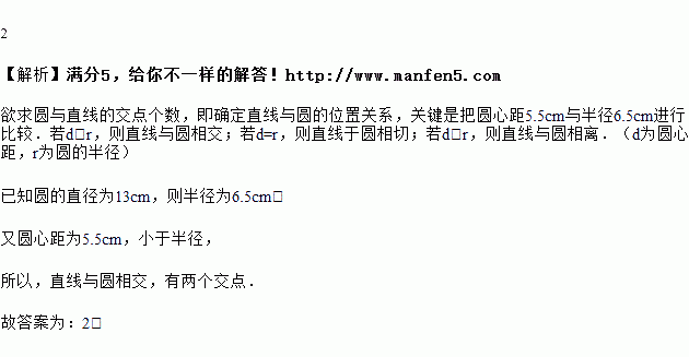 已知的直径为,如果圆心到直线的距离为,那么直线与有________个公共点.