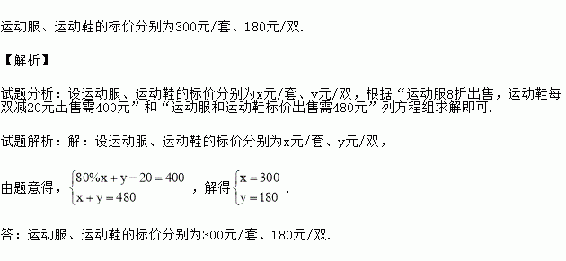 乔丹体育用品商店开展“超级星期六”促销活动:运动服8折出售,运动鞋每双减20元. 活动期间,标价为480元的某款运动服装(含一套运动服和一双运动鞋)价格为400元.问该款运动服和运动鞋的标价各是多少元?